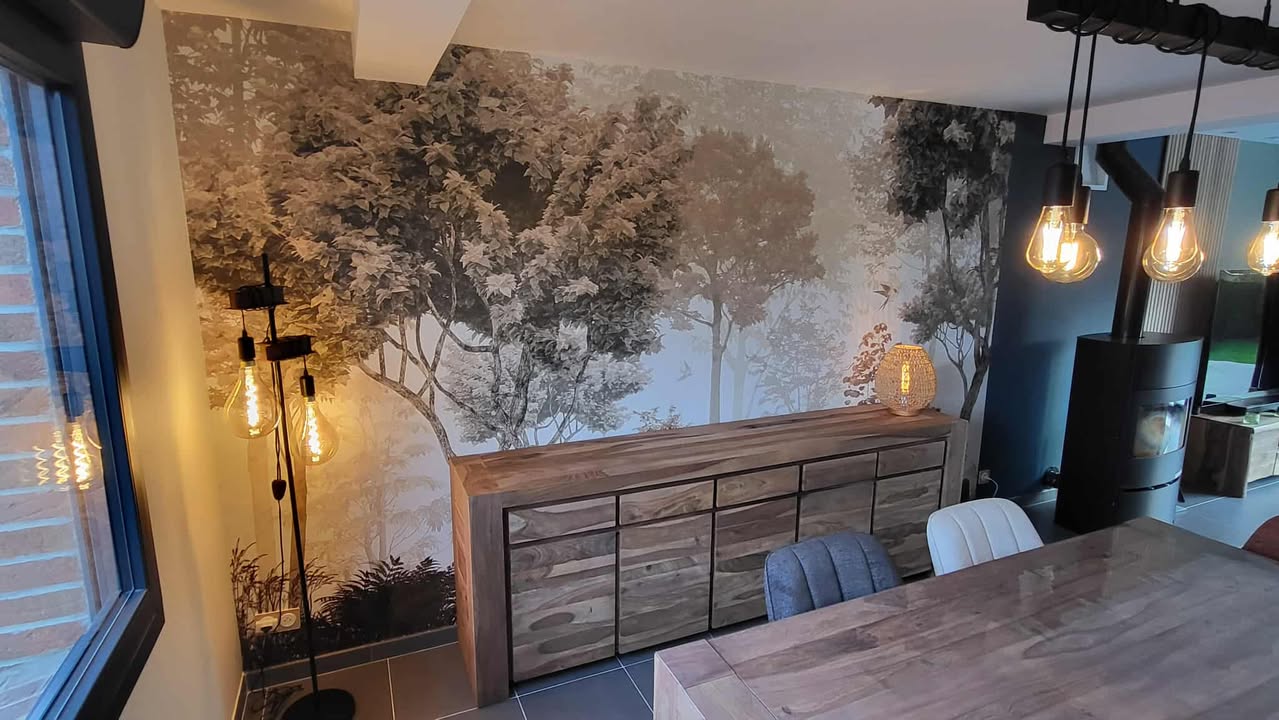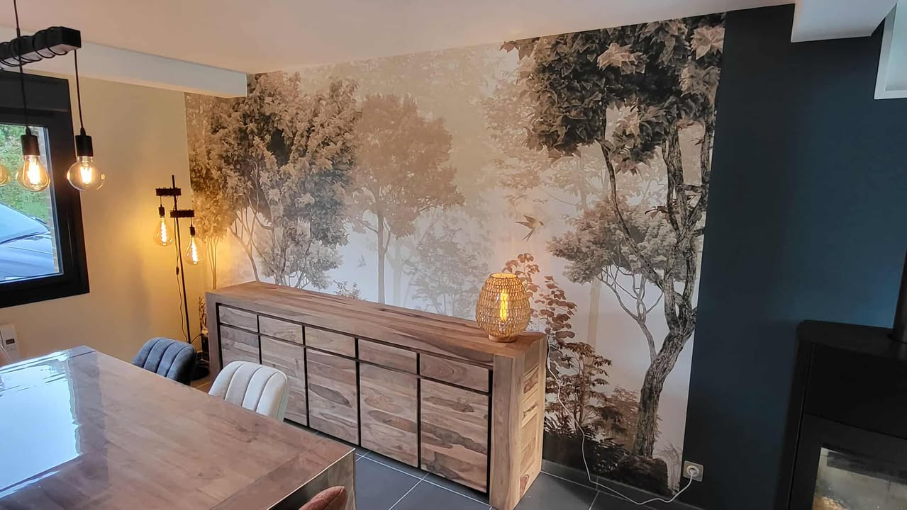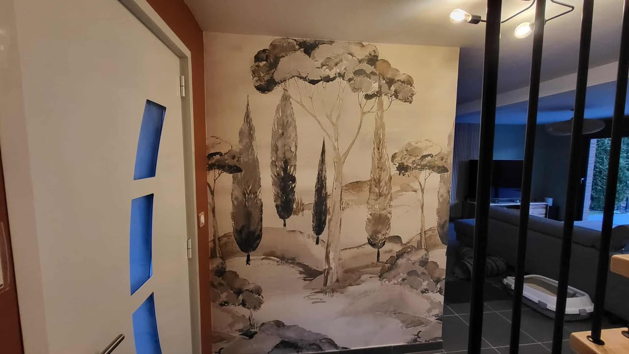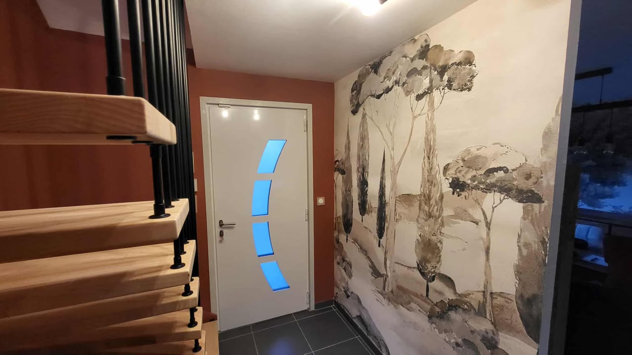 L’entrée a été repensée pour devenir un véritable espace d’accueil : plus lumineux, plus structuré et plus chaleureux. Nous avons travaillé sur les couleurs, les matières et la circulation pour créer un impact visuel dès l’arrivée dans la maison. Le choix d’un panoramique — qui créait d’abord un doute chez mes clients — s’est finalement révélé être l’élément phare du projet. Il apporte de la profondeur, une ambiance nature et ce fameux effet “Waouh” que l’on recherchait pour moderniser l’espace.
