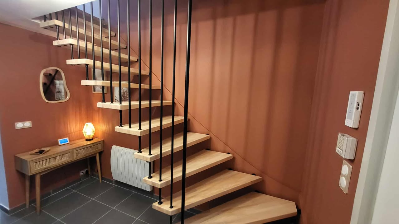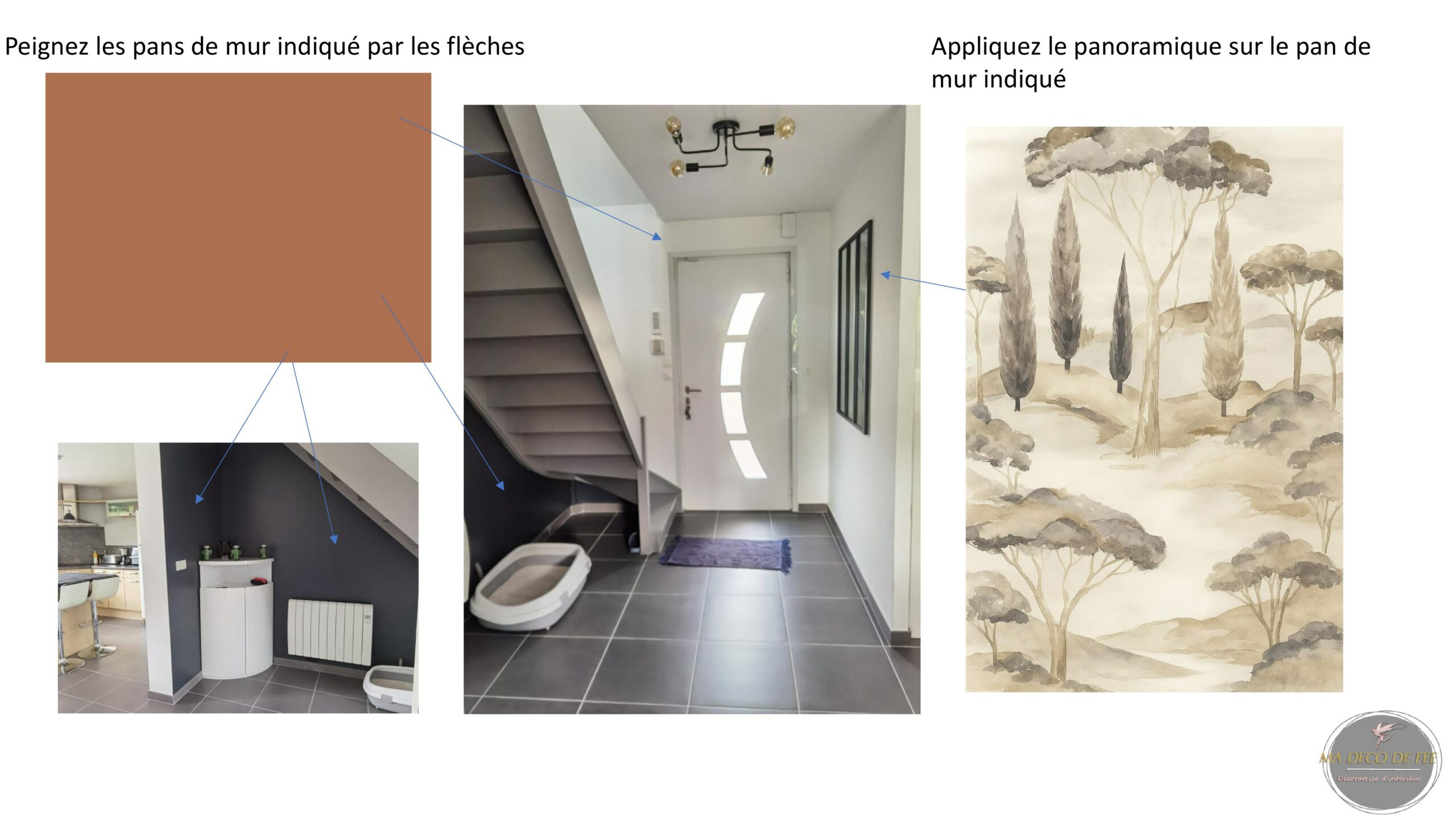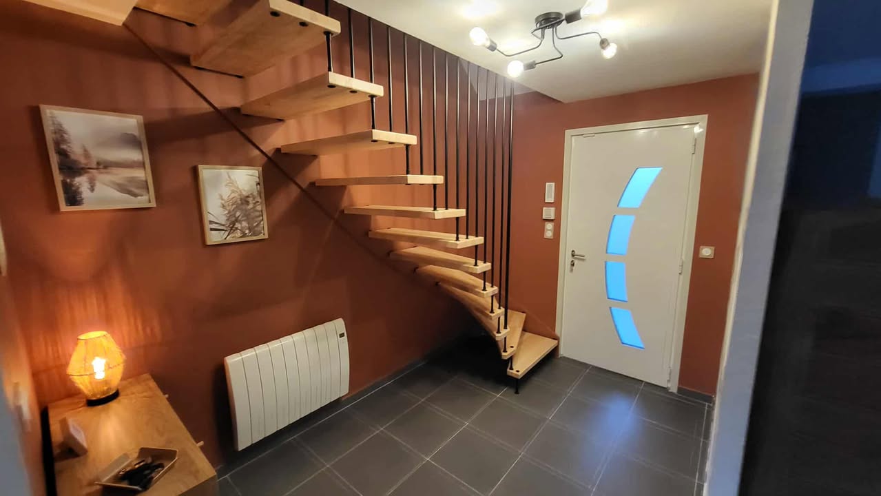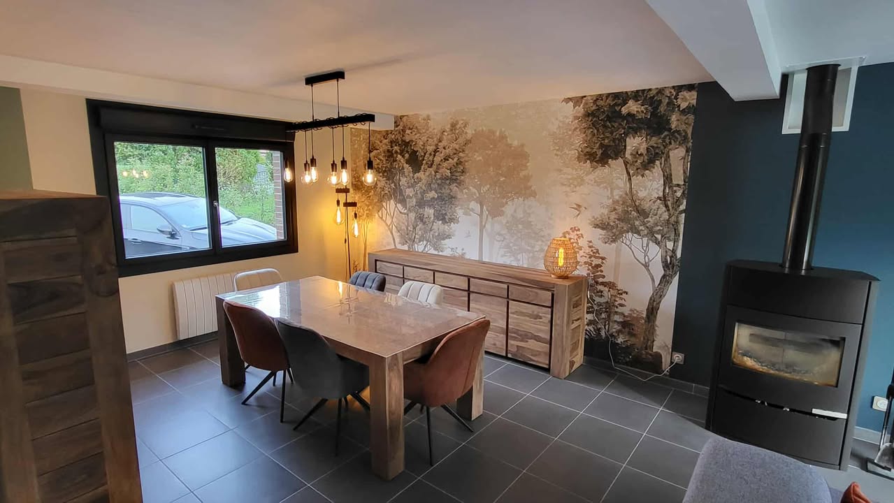L’entrée a été repensée pour devenir un véritable espace d’accueil : plus lumineux, plus structuré et plus chaleureux. Nous avons travaillé sur les couleurs, les matières et la circulation pour créer un impact visuel dès l’arrivée dans la maison. Le choix d’un panoramique — qui créait d’abord un doute chez mes clients — s’est finalement révélé être l’élément phare du projet. Il apporte de la profondeur, une ambiance nature et ce fameux effet “Waouh” que l’on recherchait pour moderniser l’espace.