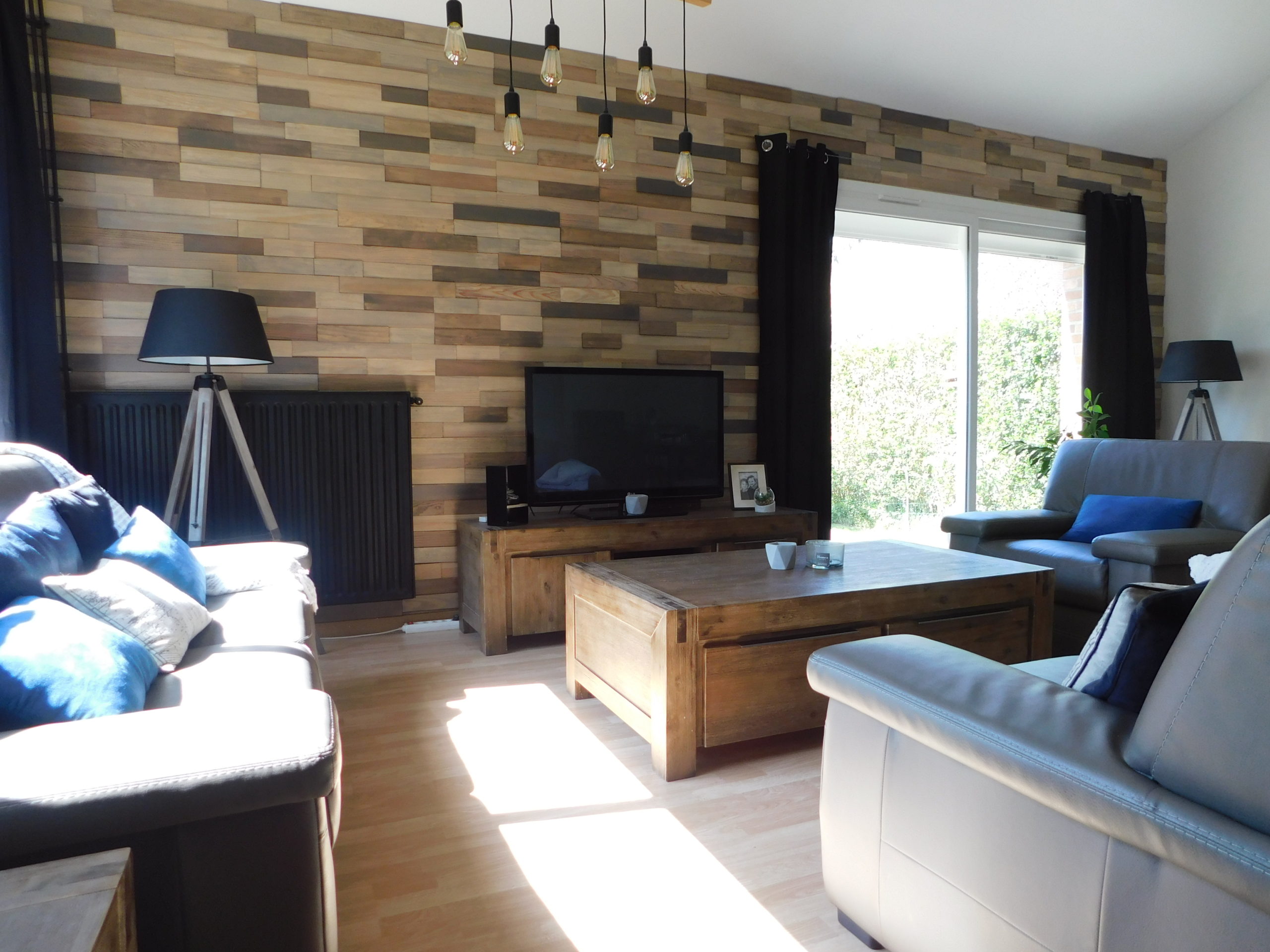 Mes clients souhaitaient une ambiance industriel légère pour leur salon. Je me suis naturellement orienter vers les matières incontournable de se style, le bois le béton et le métal. Pour le mobilier ils ont ce 3 pièces en cuir gris smoke ainsi que le meuble tv et la table basse qu’ils avaient acheté il n’y a pas très longtemps donc inutile de le changer.